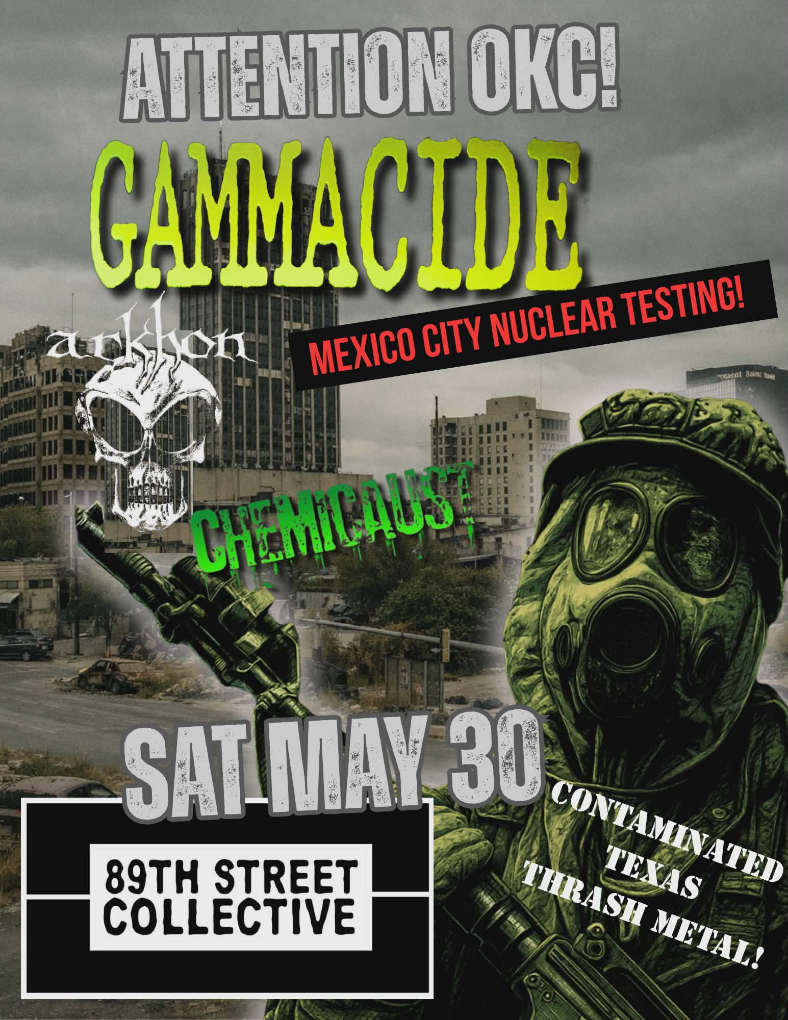 The band was founded in 1986 by Rick Perry (electric guitar) and Eric Roy (electric bass). Perry and Roy had previously played in the local cover band Warlock. The band covered various songs by Judas Priest , Iron Maiden , and Metallica . Jamey Milford (drums) and Varnam Ponville (vocals) joined the band a few months later. In a garage in Texas, they recorded their first tracks together, including some songs from their Warlock days. On March 21, 1987, they played their first small gig in Fort Worth . Two weeks later, they opened for Rigor Mortis and Watchtower at the Arcadia Theater in Dallas . In early 1987, the band participated in a "Battle of the Bands." Gammacide made it to the top eight and appeared on a local compilation cassette called Metal Cruelty .