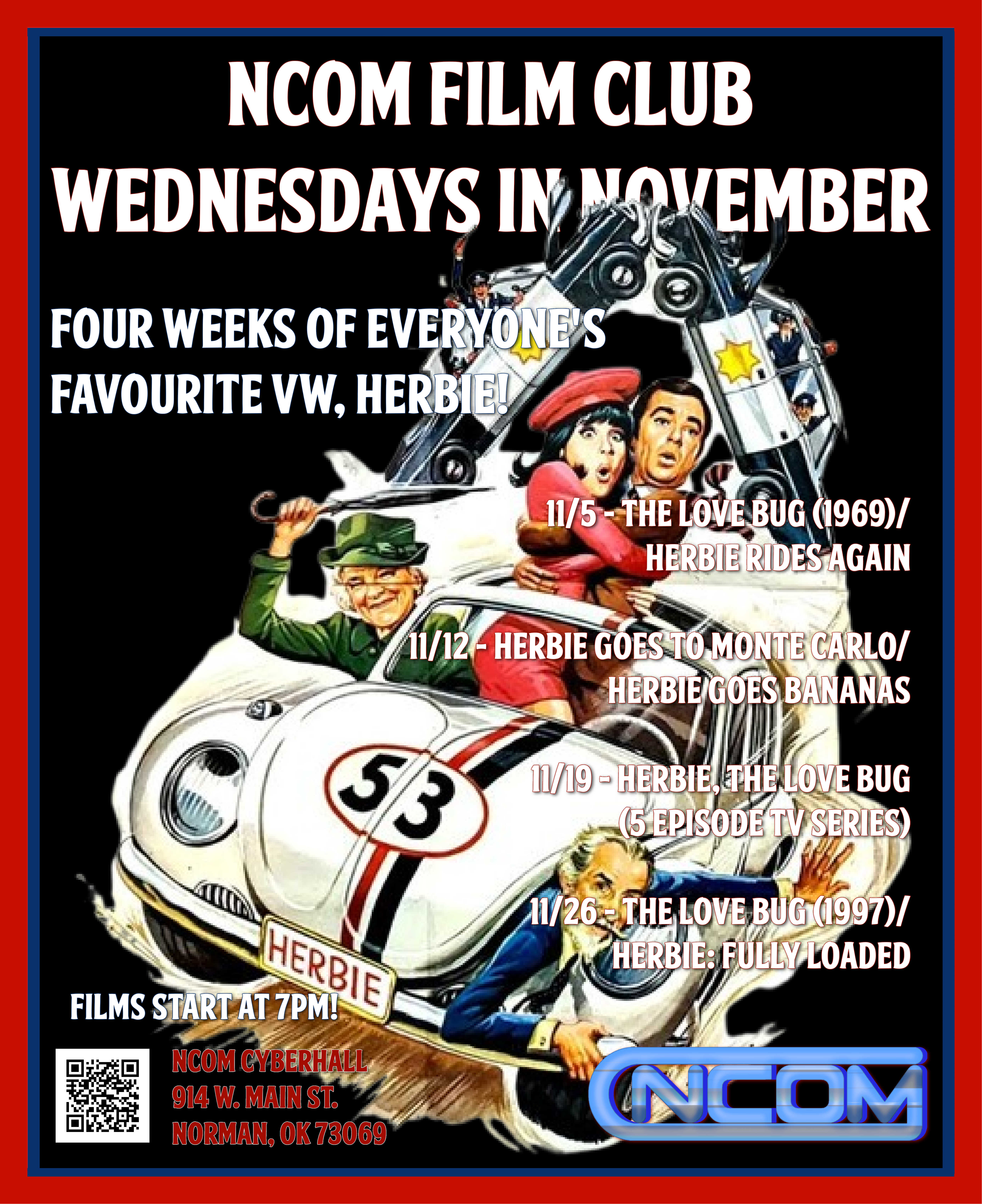 NCom Film Club's Herbie Month! The Love Bug: Has-been professional race car driver Jim and his philosophical mechanic Tennessee find themselves in possession of a white Volkswagen Beetle that seems to have a mind and spirit of its own. Naming the car Herbie, Jim and Tennessee become the talk of the California racing circuit. Sports-car dealer and circuit contestant Thorndyke tries to use his assistant to come between the friends and their car. Herbie Rides Again: Hawk is a mean-spirited property developer who has bought several blocks of land in the downtown district in order to build a gigantic shopping mall. There is one problem however; an elderly widow named Mrs. Steinmetz who won't sell the one remaining lot that Hawk needs to proceed with his scheme. So he resorts to all manner of chicanery, legal or otherwise, to get it. After they discover Alonzo's plans, it's up to Herbie to save the day and save Mrs. Steinmetz's home. Films start at 7pm. Free and open to the public with a small purchase from our snack bar. We have plenty of seating or feel free to bring your own.