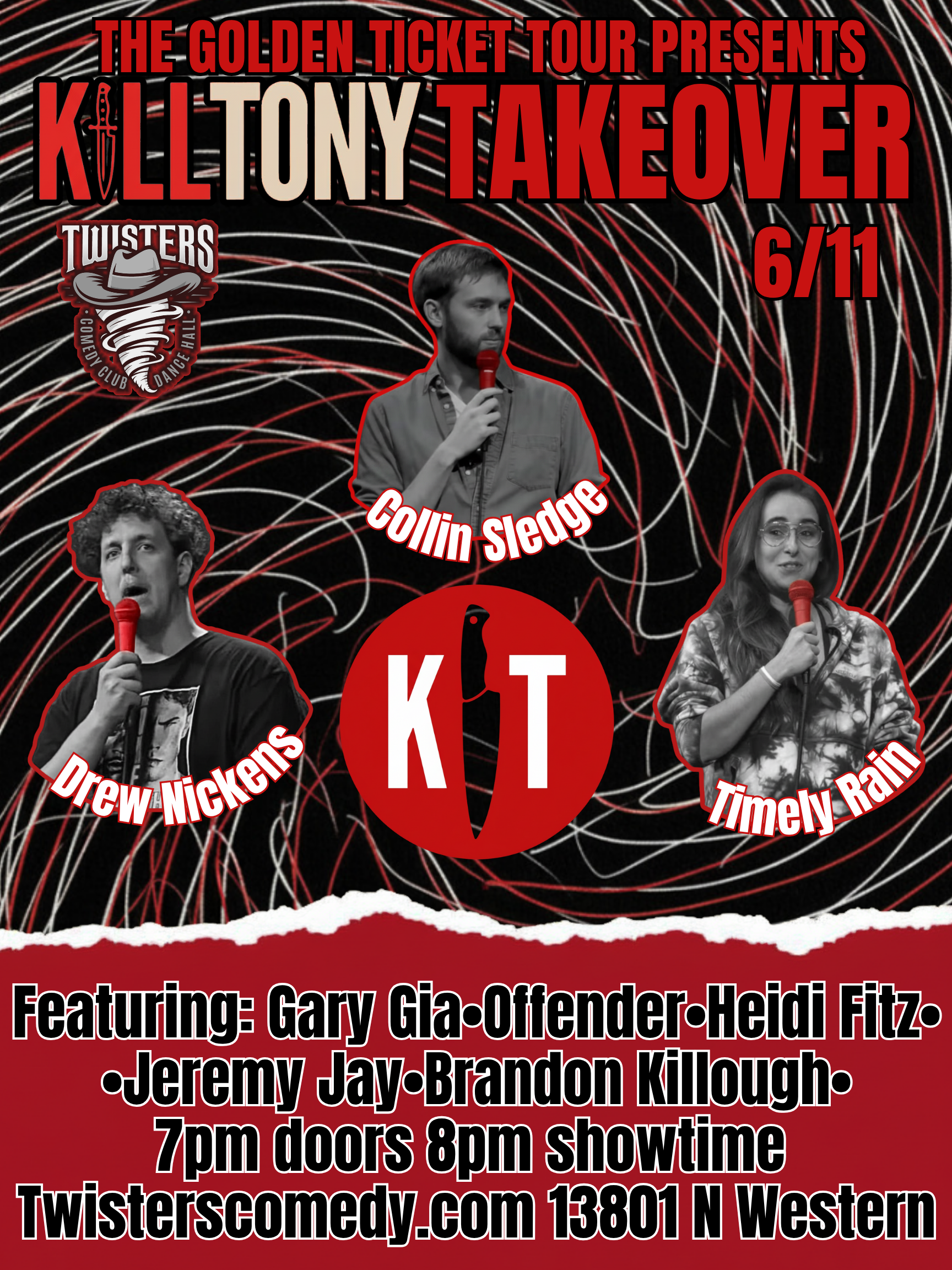 The Golden Ticket Tour Presents: Kill Tony Takeover is some folks who've made you lol on Kill Tony coming to your hometown and taking over some of your favorite local venues to bring you a night of hard laughs! Thursday June 11th the tour will be taking over Twisters Comedy Club in Edmond Oklahoma with Collin Sledge, Drew Nickens, and Timely Rain!